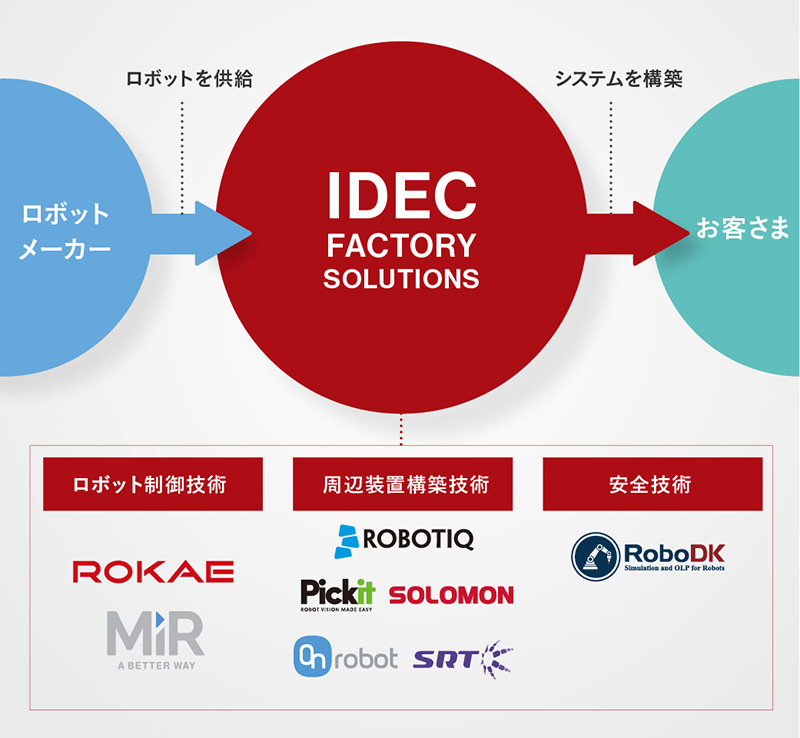 私たちは、お客さまのパートナーとしてロボットシステムを構築するロボットSIer(システムインテグレータ)の立ち位置と同時に、協働ロボットや周辺機器メーカーの販売代理店という役割も果たし、協働ロボット普及の重要な一翼を担っています。