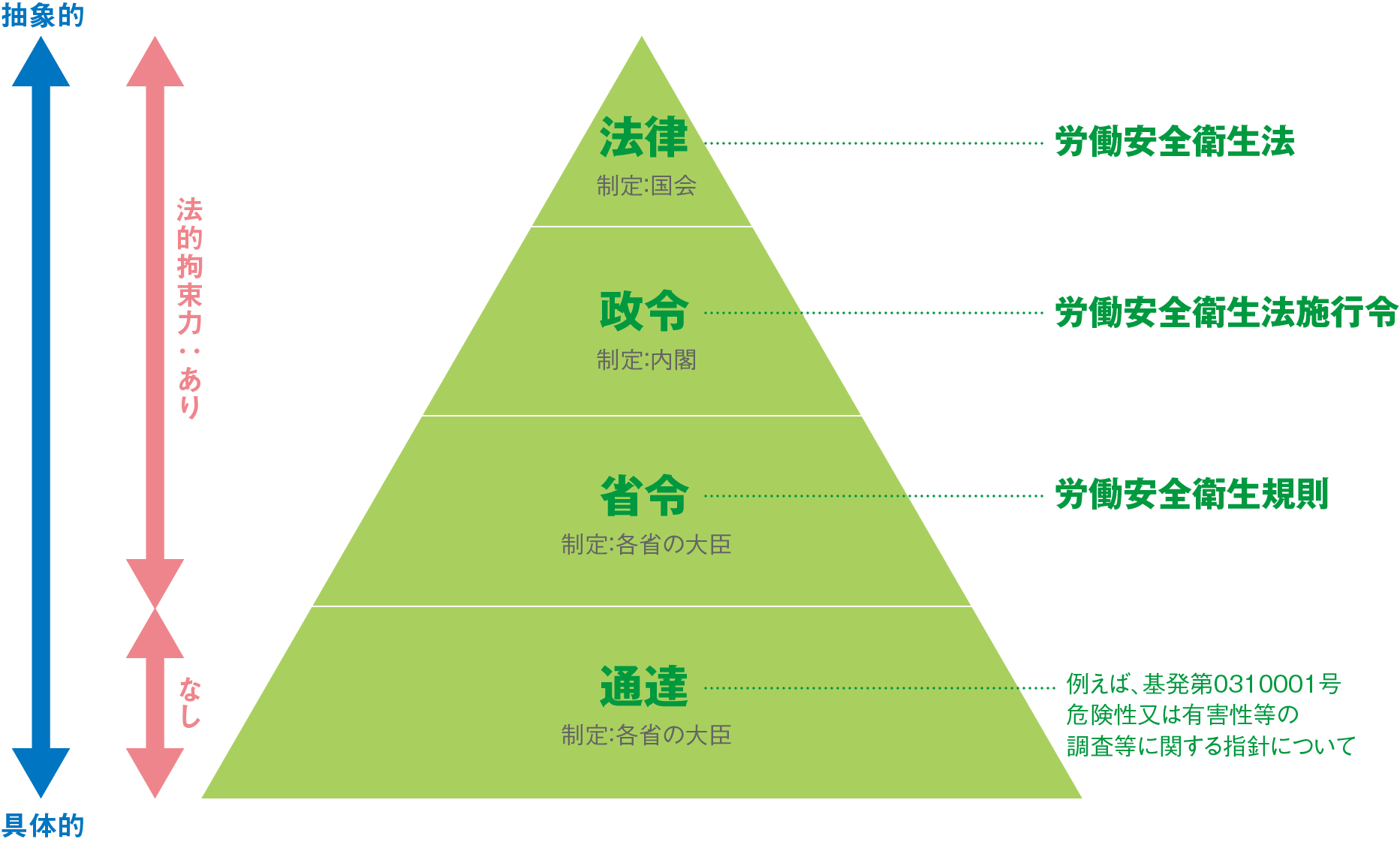 法令には法律、政令、省令などがあり、そのほかに各省が発行する通知や通達がありますが、リスクアセスメントと保護方策実施を求めた法律は、「労働安全衛生法」です。この法律は、第一条に明記されているように、事業者に対して労働者の安全と健康を確保するために定められたものであり、労働災害防止のために順守しなければならない事項が規定されています。また、法律の施行に伴う具体的な事項については、政令や省令または通知や通達等で示されます。特に、リスクアセスメントや機械安全化に関して規定したものは、省令では「労働安全衛生規則」、指針では「機械の包括的な安全に関する指針」になります。