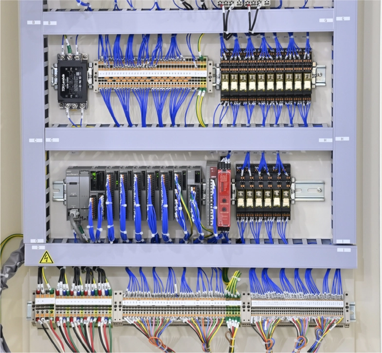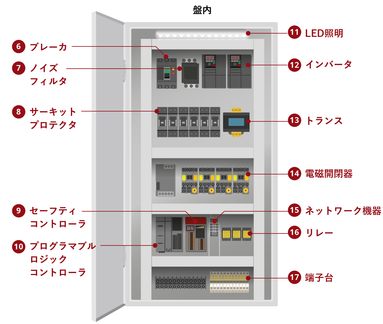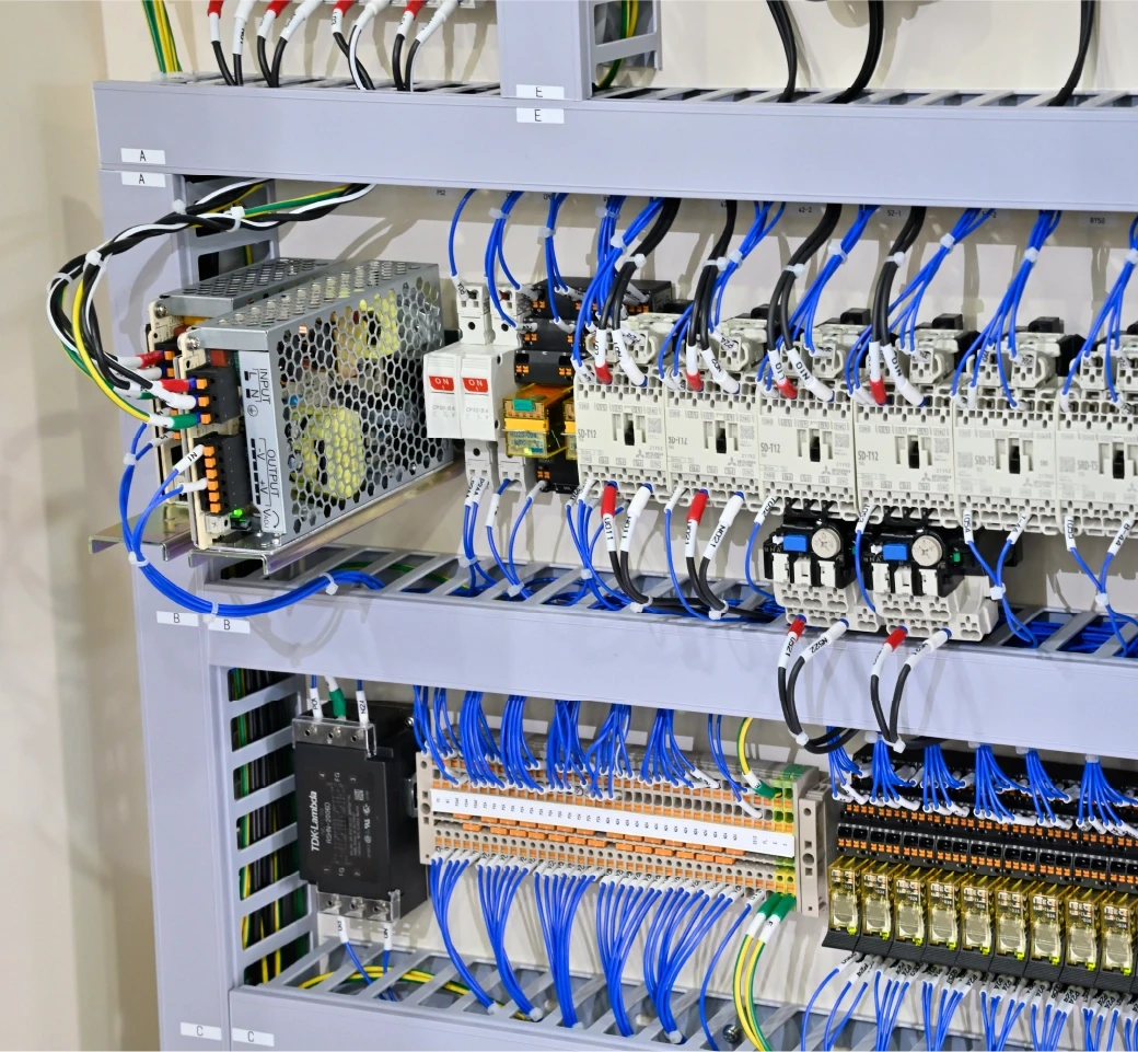• 制御盤とは、産業用機械や設備を安全かつ効率的に動作させるための「頭脳」となる装置で、内部には電源機器、制御機器、保護機器、配線機器などが組み込まれます。